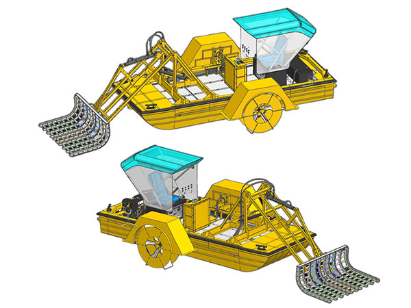 Boat for removing aquatic weeds in canals and ponds. Single-operator design enables efficient, low-cost waterway maintenance where large machines aren't practical.