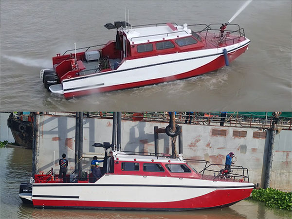 Fire Fight Boat with advanced hull construction using jig and robotic systems. Features buoyancy-assist and supports high-pressure water cannons for rapid emergency response.